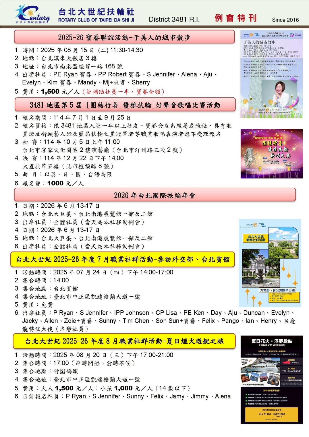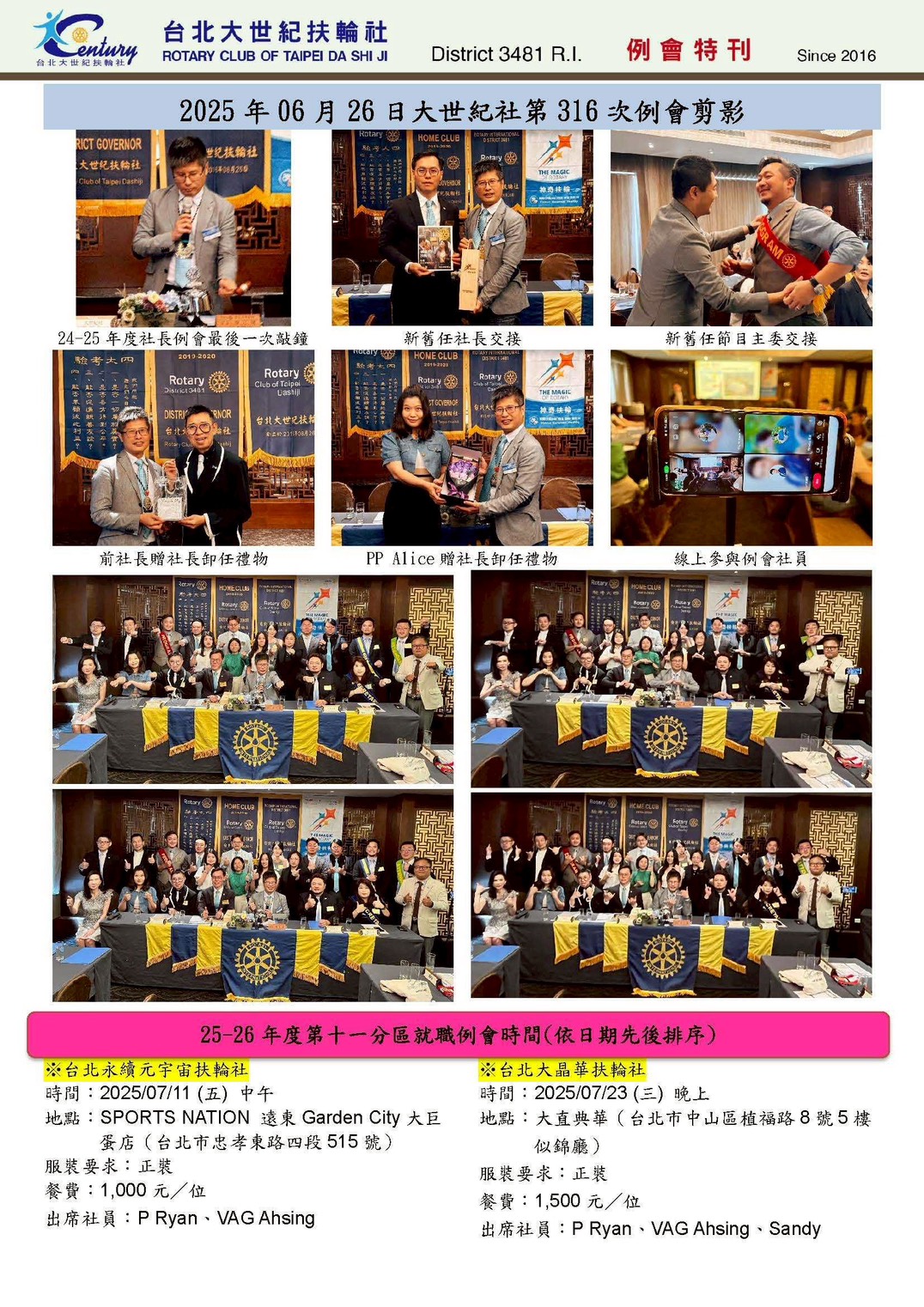 接下來7-8月大世紀有3次例會在花園酒店,敬邀大家一同參與~